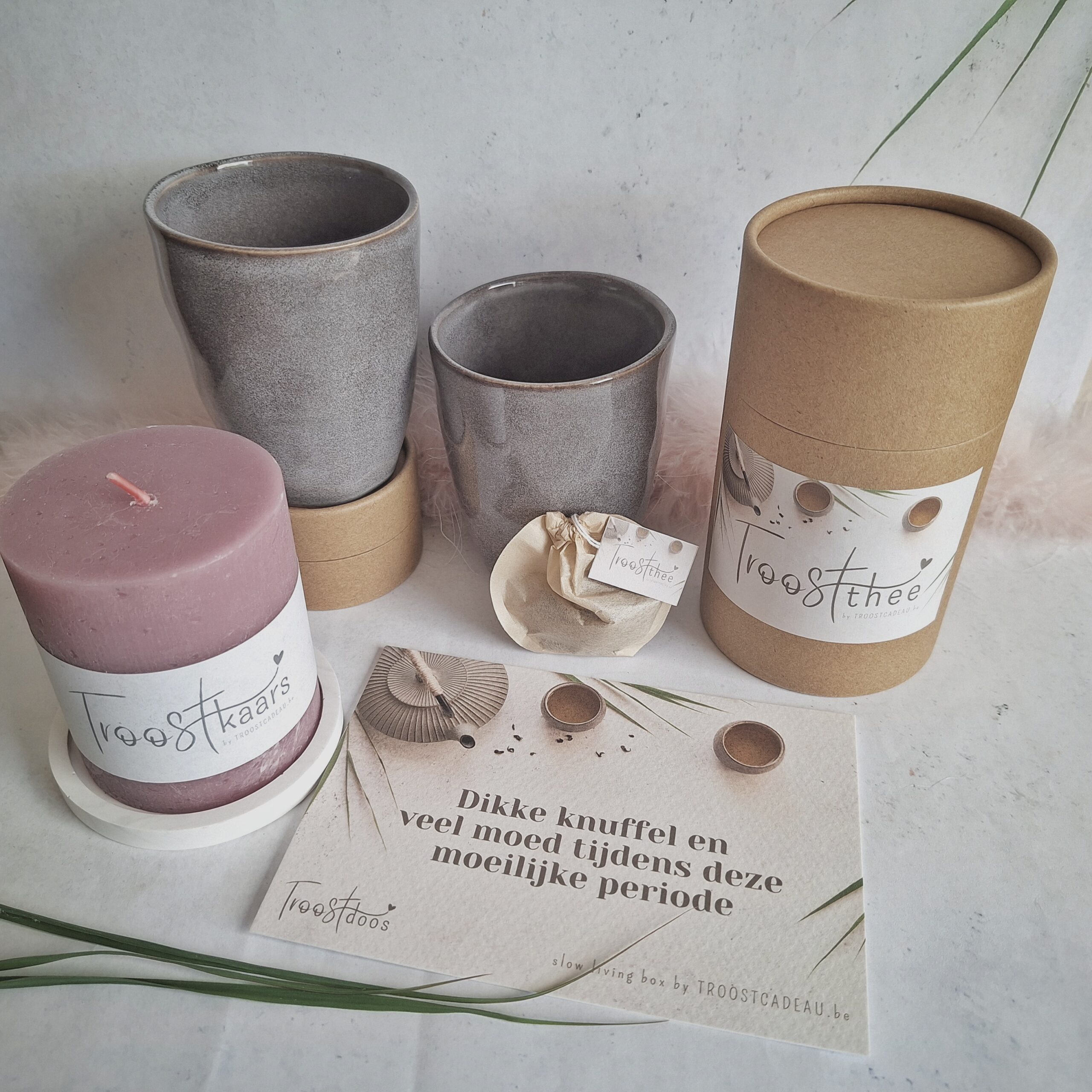 Deze slow living troostdoos bevat met zorg geselecteerde troostcadeautjes die uitnodigen tot verstilling en aandacht. Een betekenisvol geschenk dat helpt om te vertragen, emoties toe te laten en weer verbinding te maken met jezelf, juist wanneer het leven even stilvalt door verlies of verdriet.