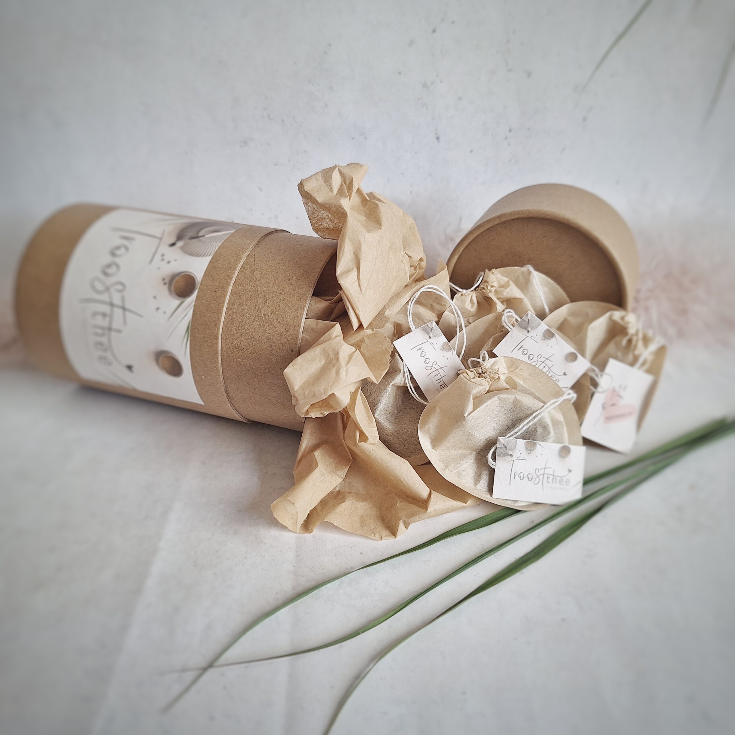 - Zorgvuldig en stijlvol verpakt met oog voor de natuur. De troost attenties worden liefdevol ingepakt in zacht, zuurstofgebleekt zijdepapier, volledig chloorvrij en milieuvriendelijk geproduceerd. De verpakking wordt afgewerkt met een natuurlijk jute touw en een handgemaakt troostlabel, voor een pure, warme uitstraling die past bij de inhoud: een geschenk dat écht iets betekent.