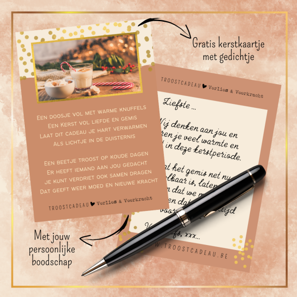 De Kerstperiode is een tijd vol emoties, zeker als je iemand moet missen.  Ben jij op zoek naar een troostend en betekenisvol kerstcadeautje voor iemand die een geliefde mist?  Iemand die recent of langer geleden geconfronteerd werd met verlies en verdriet?  Bied deze kerst extra steun met dit mooie troostplekje ‘kerst sprankel’. Het betekent veel voor iemand als je toont dat je met Kerst aandacht hebt voor iemands gemis.  Op het zelf ontworpen kaartje schrijf ik jouw persoonlijk tekstje.