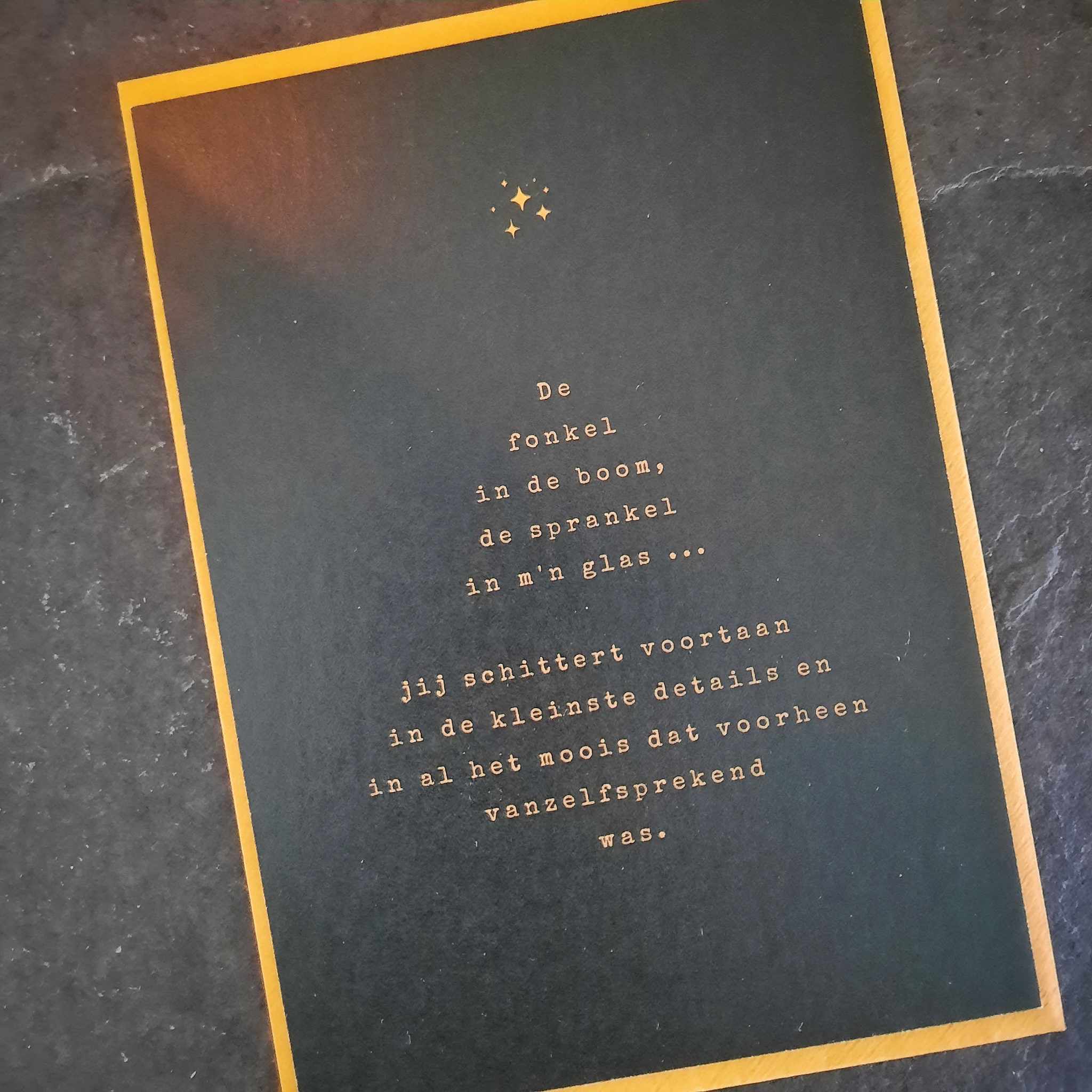 • Stevige, stijlvolle kaart ‘kerst sprankel’ met okergele envelop
